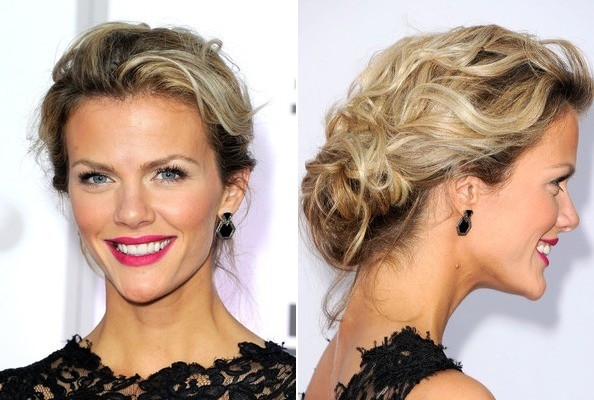 Os fios ondulados (enrolados em um babyliss largo ou com bobs médios) ganharam um toque de charme jogando todo o comprimento para trás e prendendo em um coque alto e fofo. Tome o cuidado de deixar algumas mechas da franja soltas e onduladas na lateral.